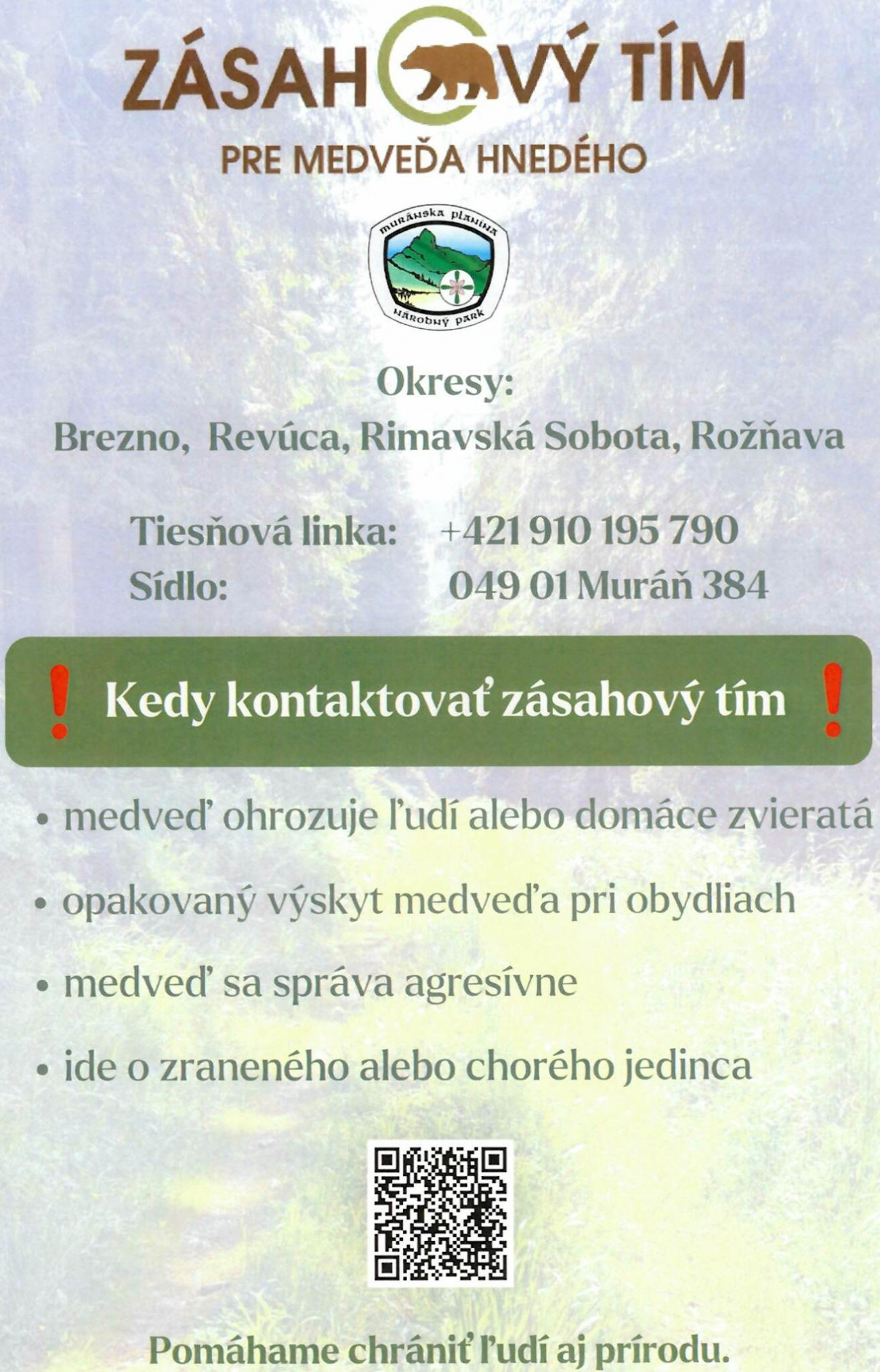 V tomto období prebieha monitoring výskytu medveďa hnedého s cieľom čo najpresnejšie vyhodnotiť jeho pohyb v regióne. Obyvatelia sa môžu na tomto monitoringu podieľať na dobrovoľnej báze. V prípade záujmu o spoluprácu je možné obrátiť sa na Zásahový tím Muráň, ktorý poskytne bližšie informácie a metodické usmernenie k zberu biologického materiálu (najmä trusu a srsti).